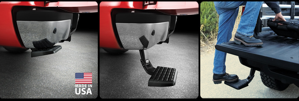The Bumper Step is a retractable bumper step that quickly flips down with the nudge of a foot providing a faster, easier and safer way to load or unload your pickup’s cargo. Supports up to 300 lbs. Frame-mounts, under the rear bumper so it works even with an open tailgate or when towing