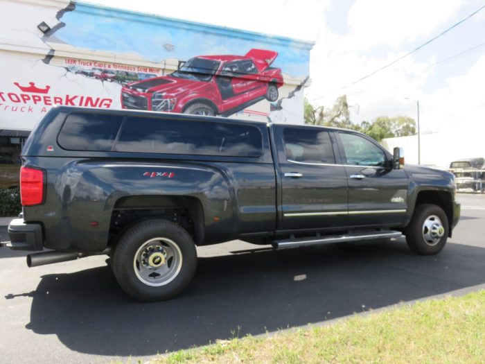 We recently had the pleasure of accessorizing this green 2018 Chevy Silverado with a brand new LEER 100XL  fiberglass topper and Stainless Steel Nerf bars.