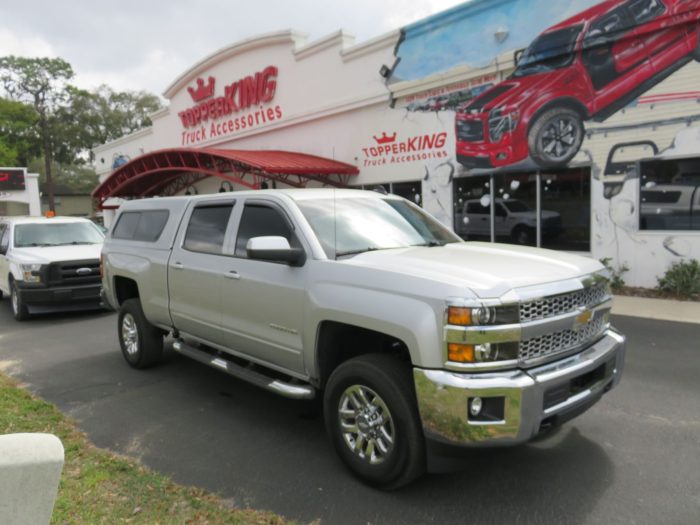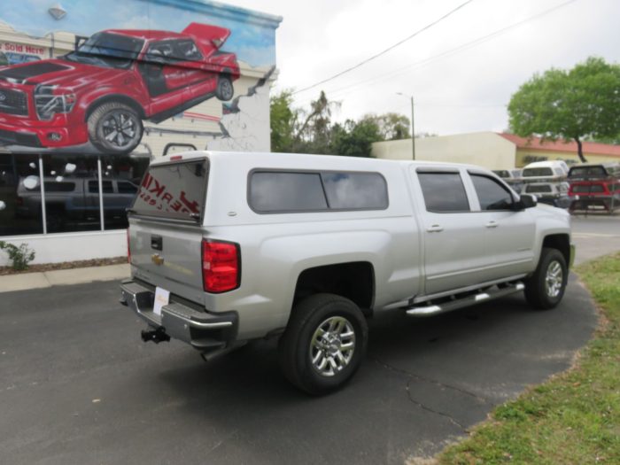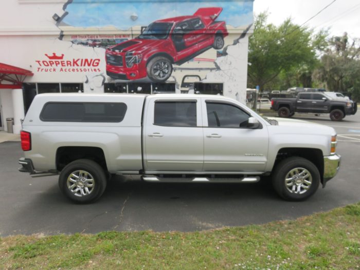We recently had the pleasure of accessorizing this 2018 silver Chevy Silverado 2500 with a Ranch Sierra topper