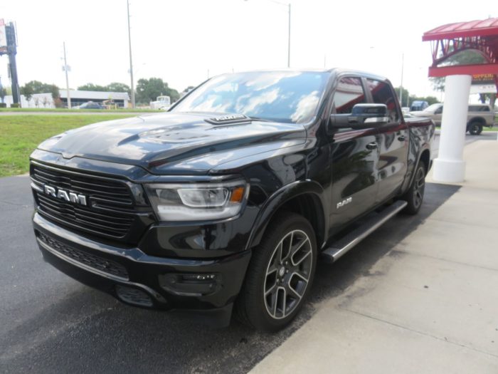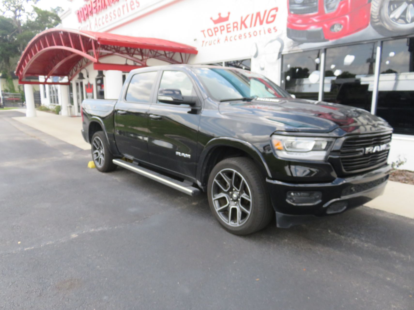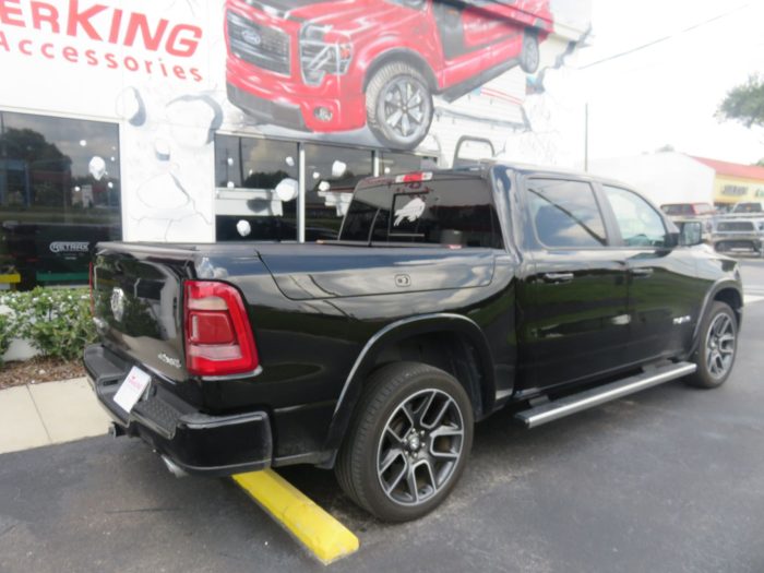 We recently had the pleasure of accessorizing this black 2019 Dodge RAM with a brand new Roll-n-Lock Retractable Cover and Stainless Steel Nerf bars.