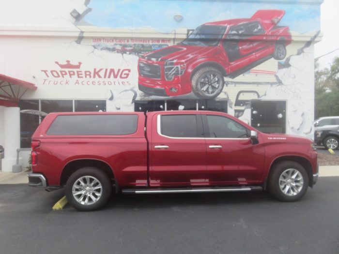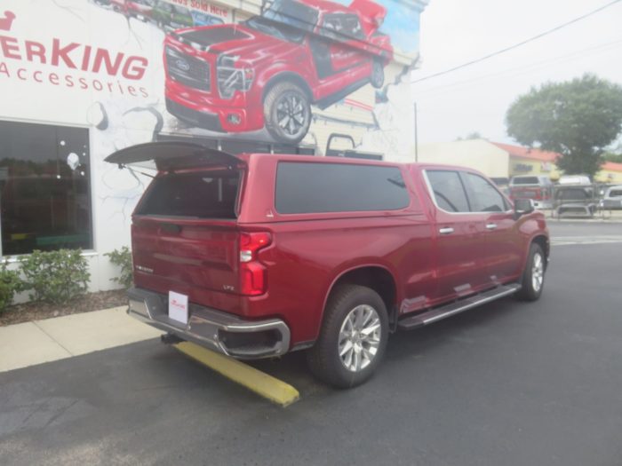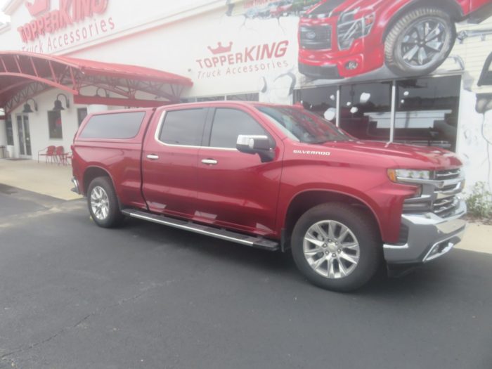 We recently had the pleasure of accessorizing this red 2019 Chevy Silverado with a brand new LEER 100XQ fiberglass topper and Stainless Steel Nerf bars.