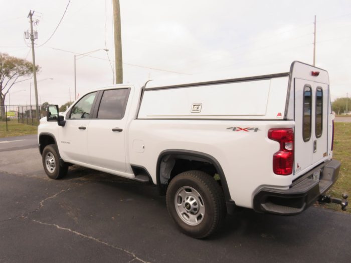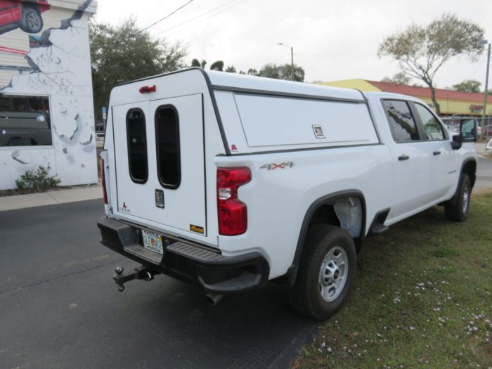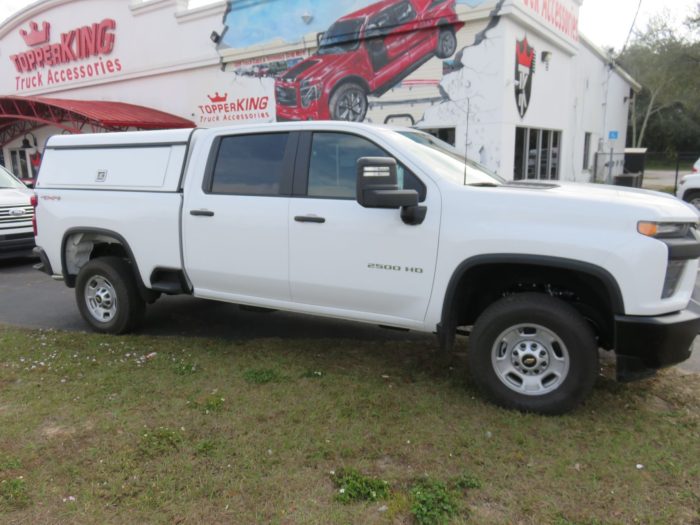We recently had the pleasure of accessorizing this white 2020 Chev Silverado with a brand new LEER DCC Construction topper and Custom Hitch.