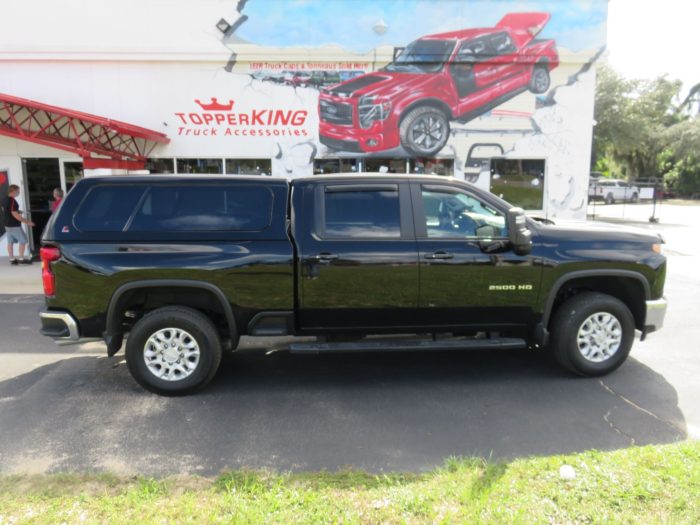 We recently had the pleasure of accessorizing this black 2020 Chevrolet Silverado with a brand new LEER 100XL fiberglass topper and Blacked Out Nerf bars.