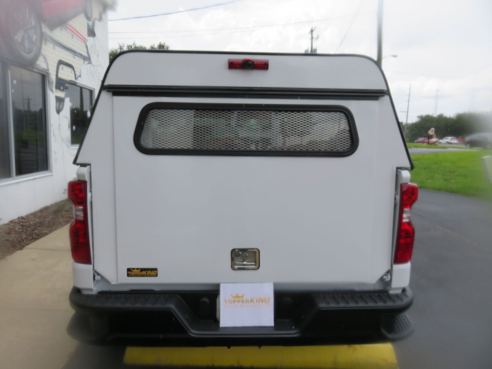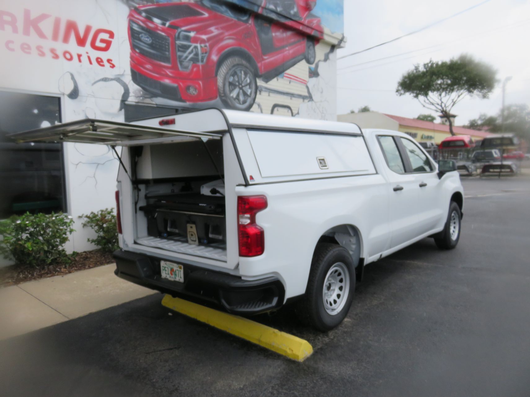 We recently had the pleasure of accessorizing this white 2020 Chevy Silverado with a brand new LEER DCC Commercial topper and Side Access Doors.