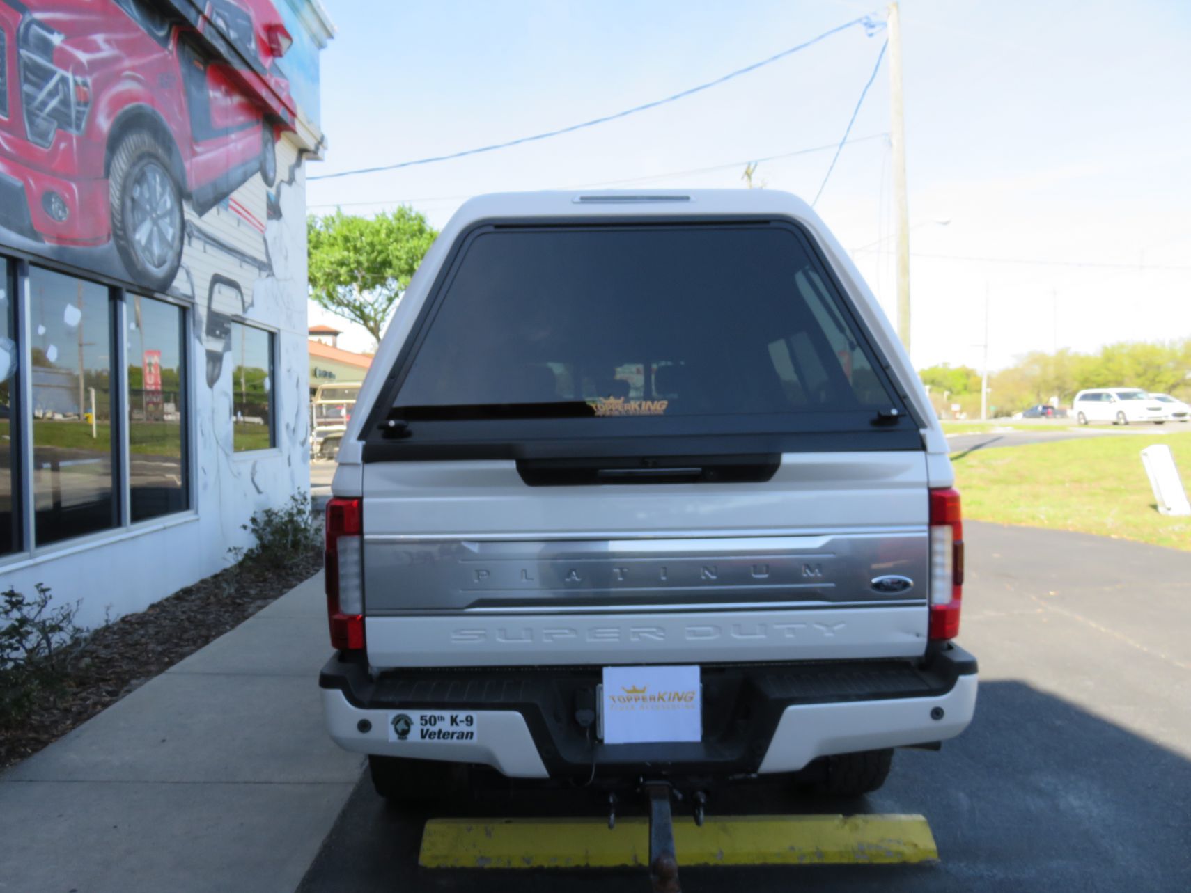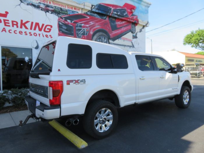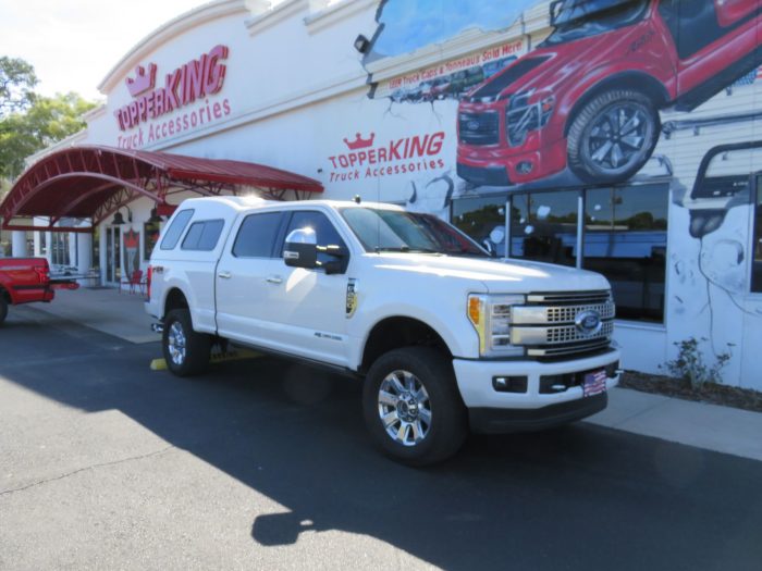 We recently had the pleasure of accessorizing this white 2020 Ford F250 with a brand new LEER 122 fiberglass topper and Hitch.