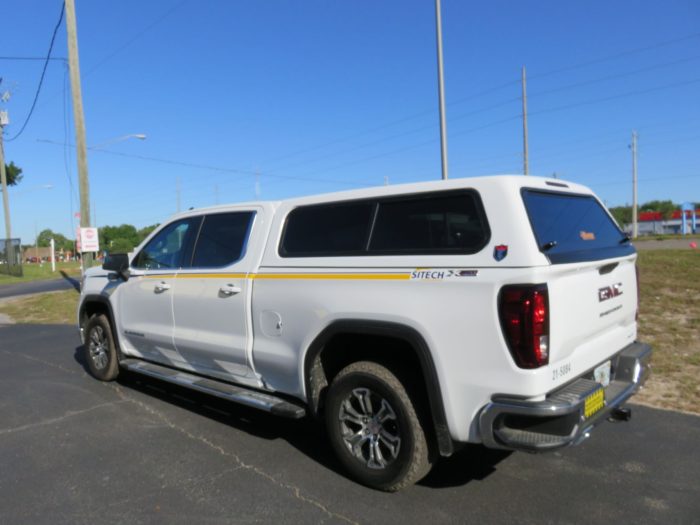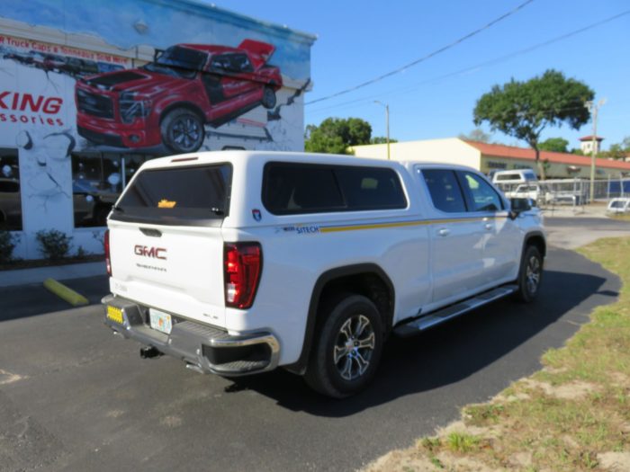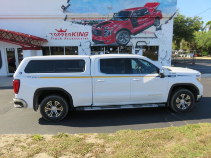 We recently had the pleasure of accessorizing this white 2020 GMC Sierra with a brand new TK Defender fiberglass topper and Running Boards.