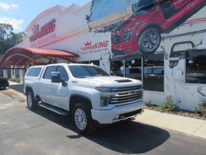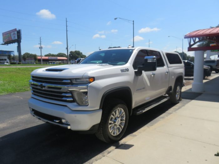 We recently had the pleasure of accessorizing this white 2020 Chevy Silverado with a brand new LEER 100XL fiberglass topper and Stainless Steel Nerf bars.