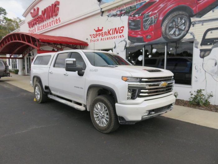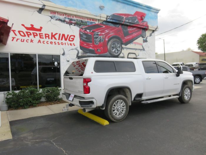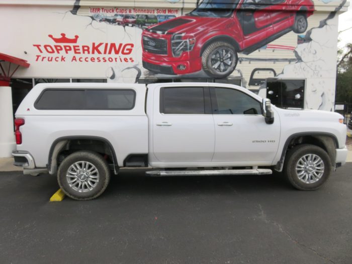 We recently had the pleasure of accessorizing this white 2020 Chevy Silverado with a brand new LEER 100XR fiberglass topper and Stainless Steel Nerf bars.