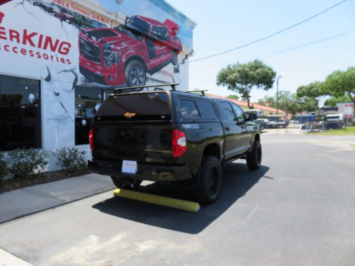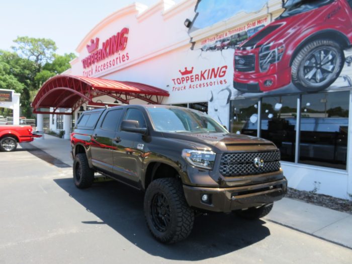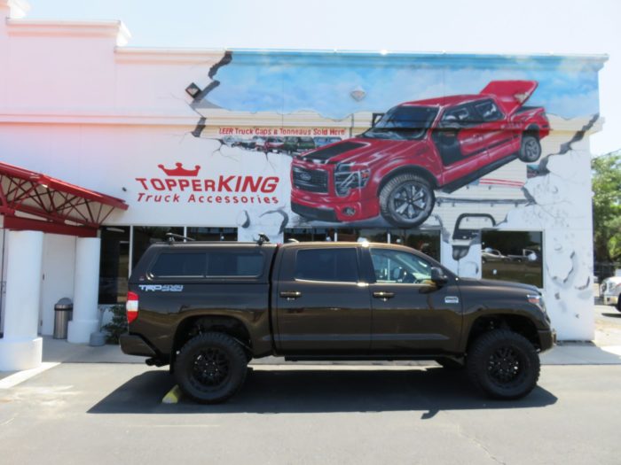 We recently had the pleasure of accessorizing this brown 2021 Toyota Tundra with a brand new LEER 100XQ fiberglass topper and Roof Racks.