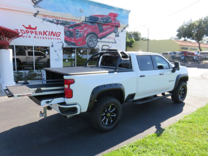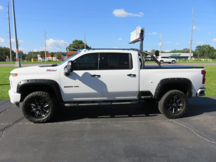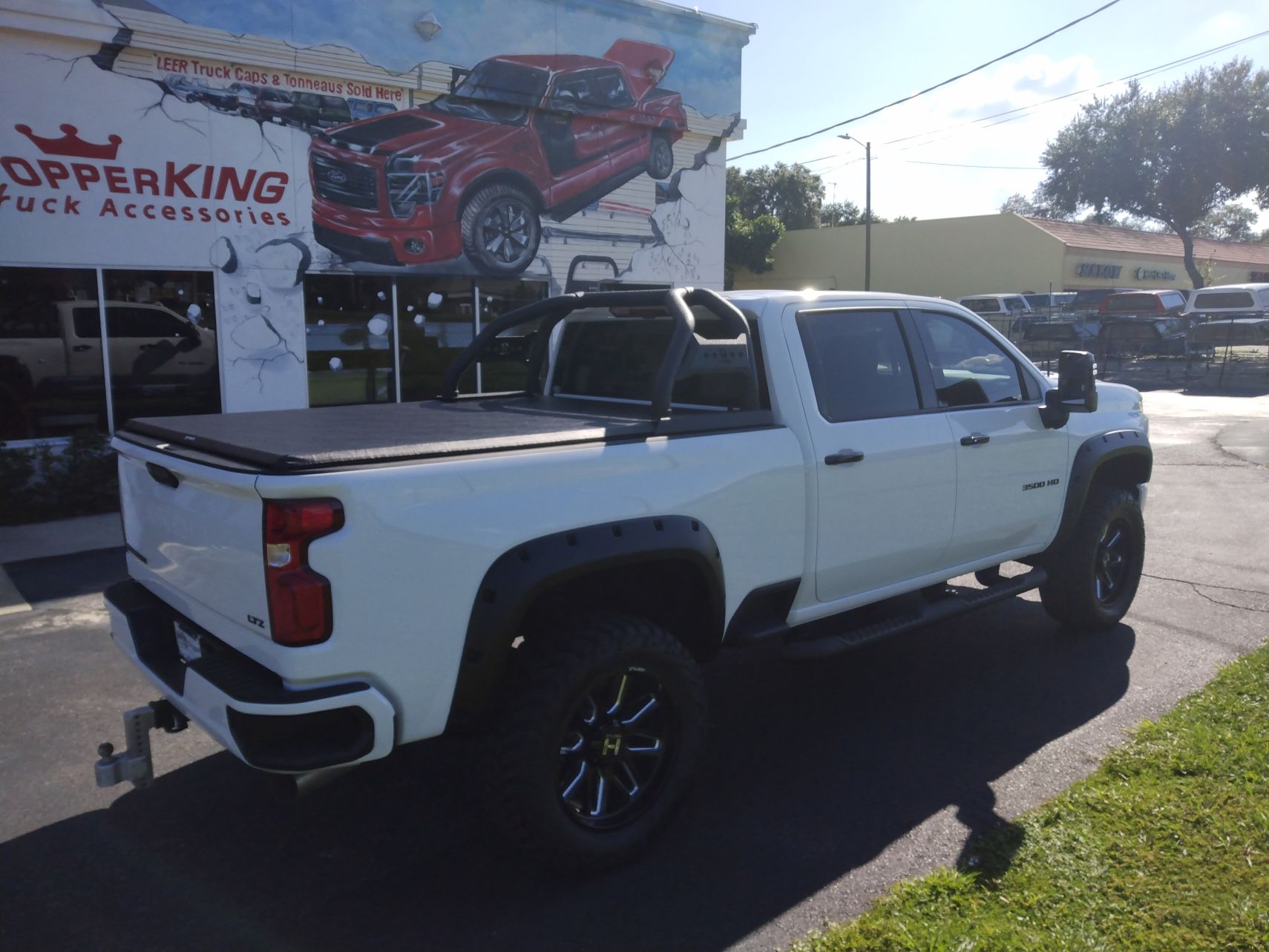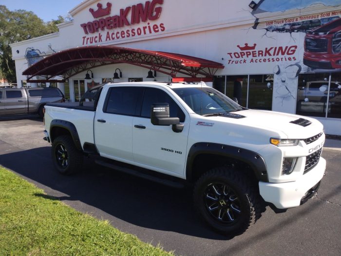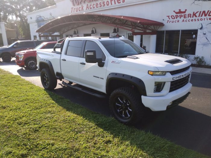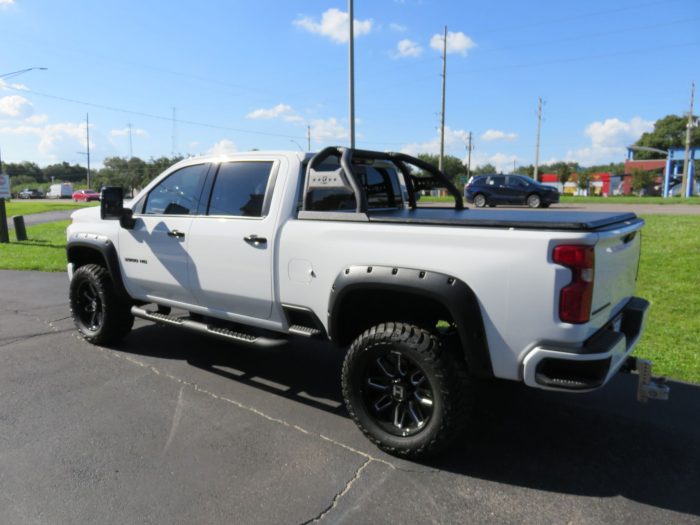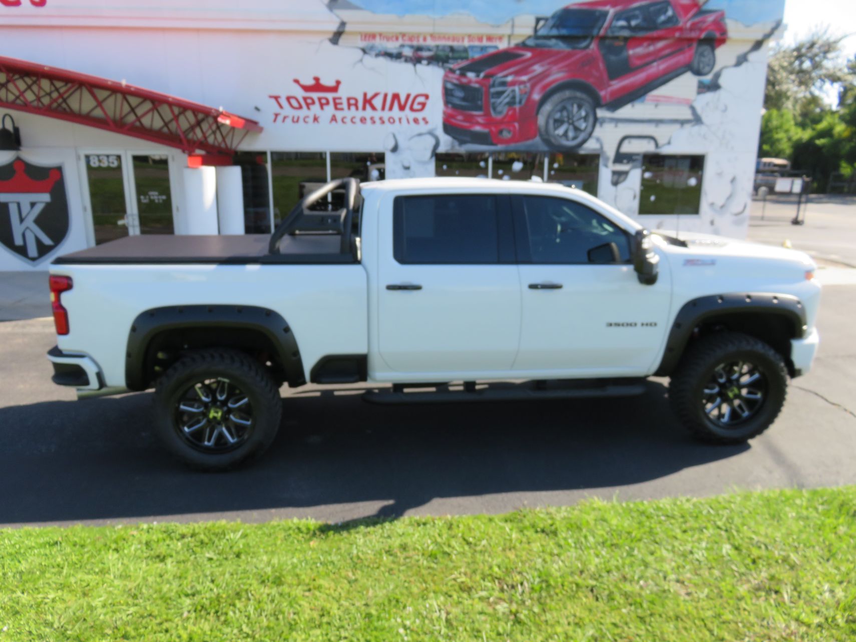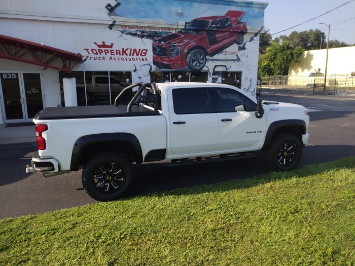 We recently had the pleasure of accessorizing this white 2022 Chevy 2500 with a sport bar, Truxedo Truxport, and fender flares.