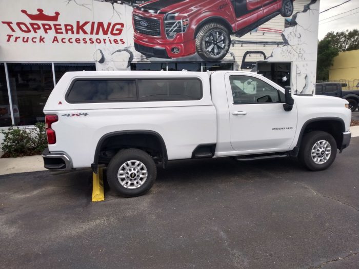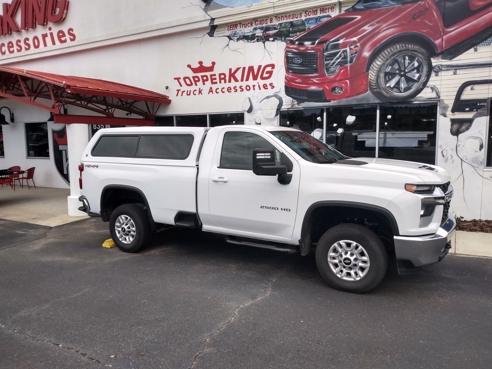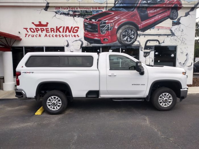We recently had the pleasure of accessorizing this 2022 white Chevy 2500 with a brand new Leer 100XR fiberglass topper: