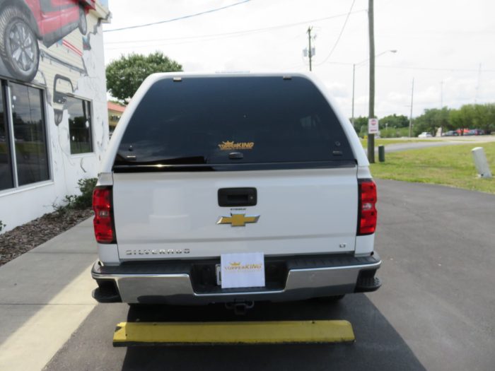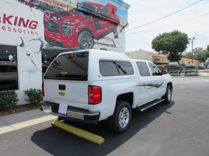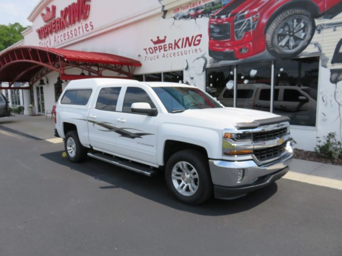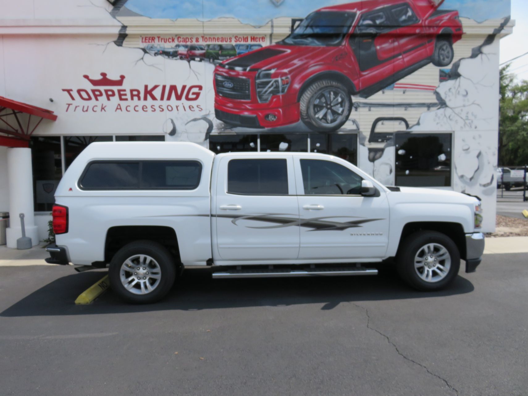 We recently had the pleasure of accessorizing this white 2018 Chevy Silverado with a brand new LEER 180 fiberglass topper and Custom Vehicle Graphics.