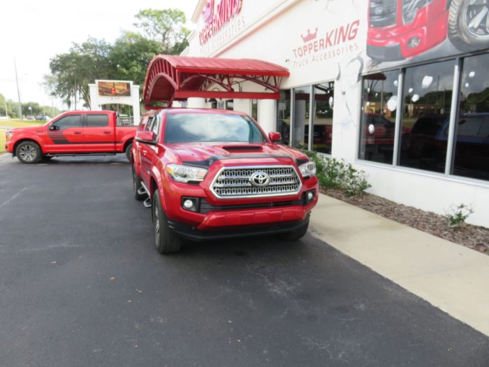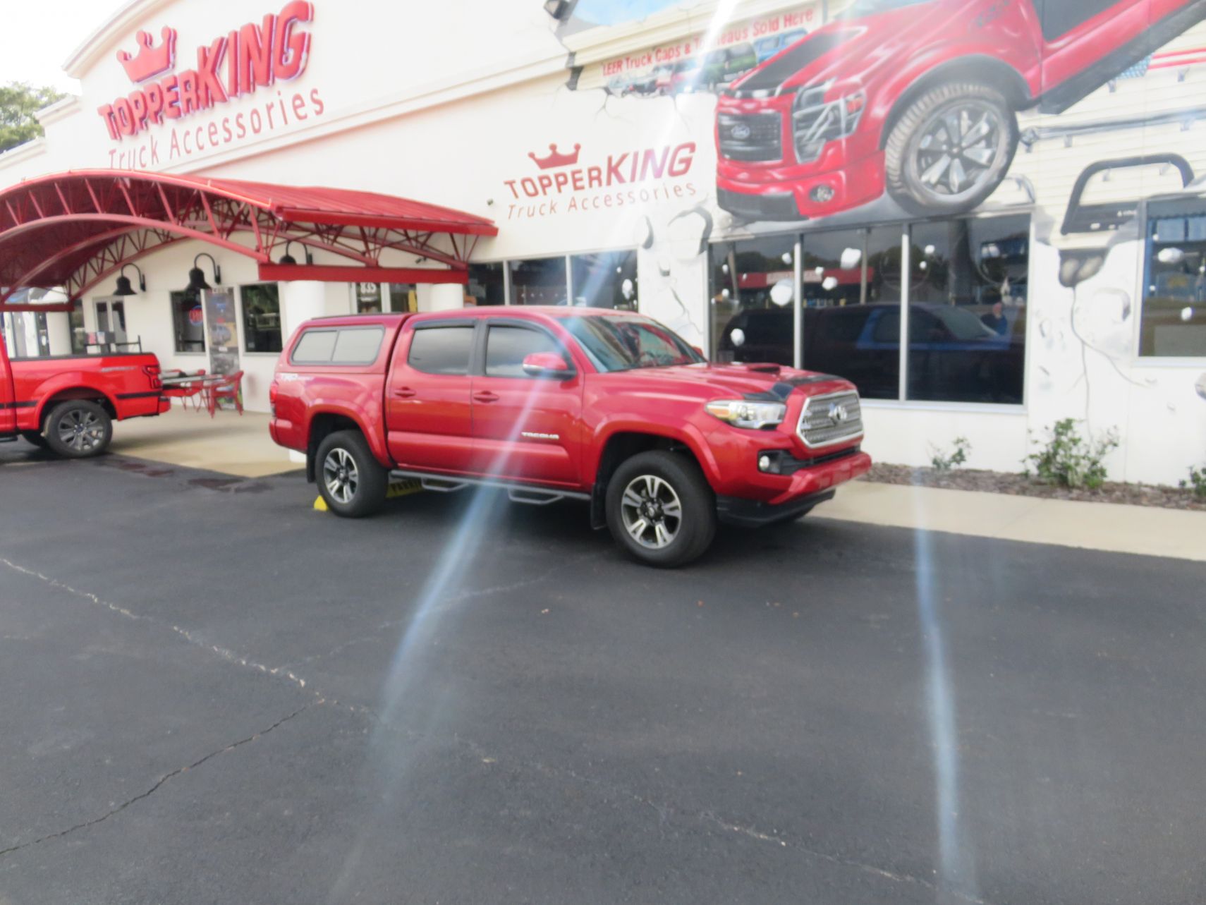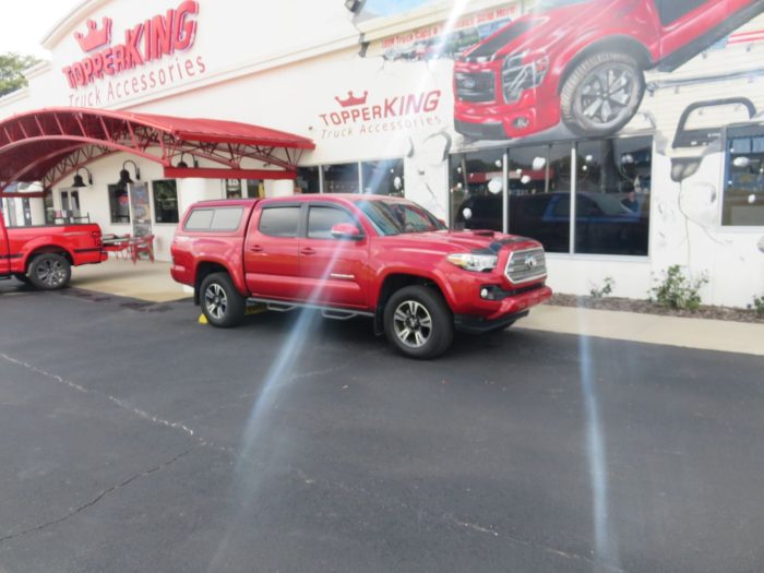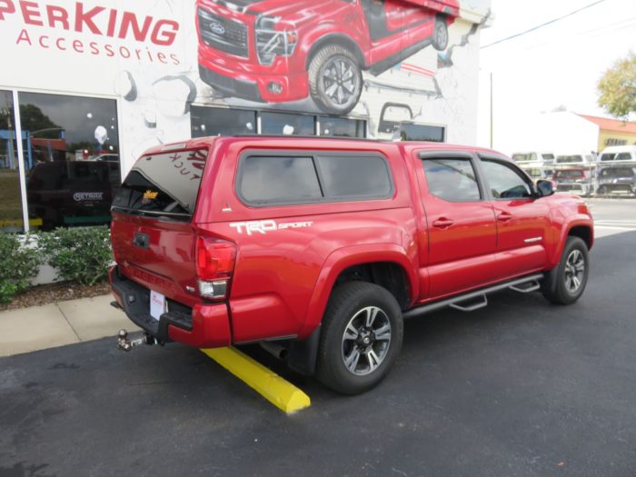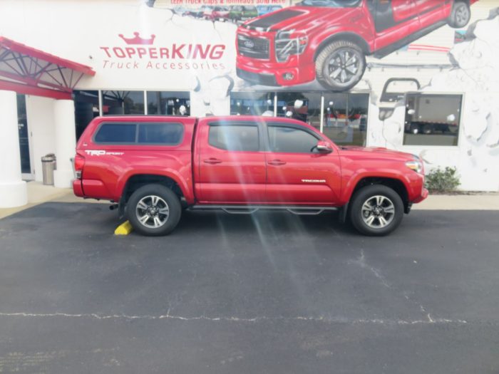 We recently had the pleasure of accessorizing this 2020 red Toyota Tacoma with a brand new LEER 100XR  fiberglass topper and Stainless Steel Nerf bars.