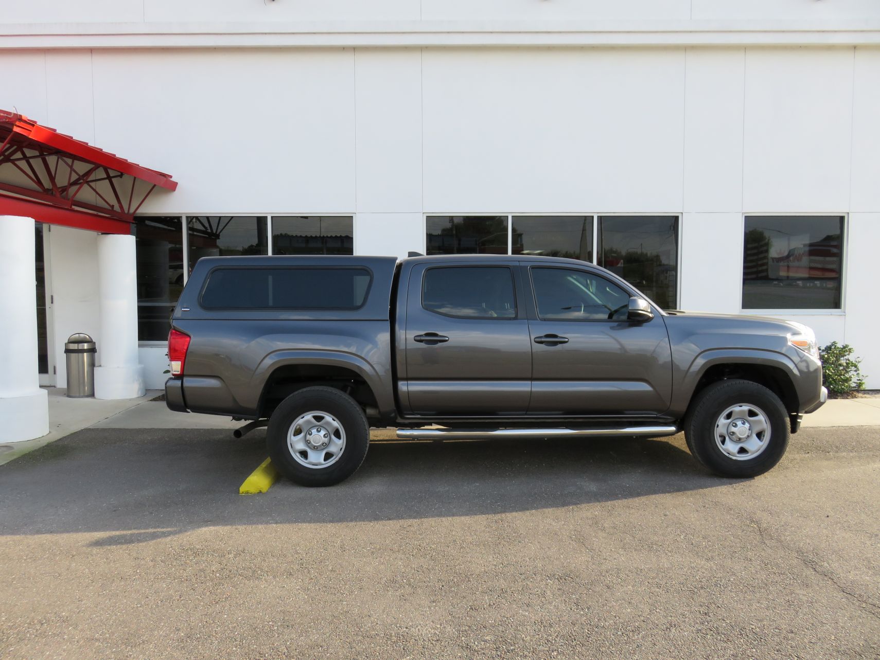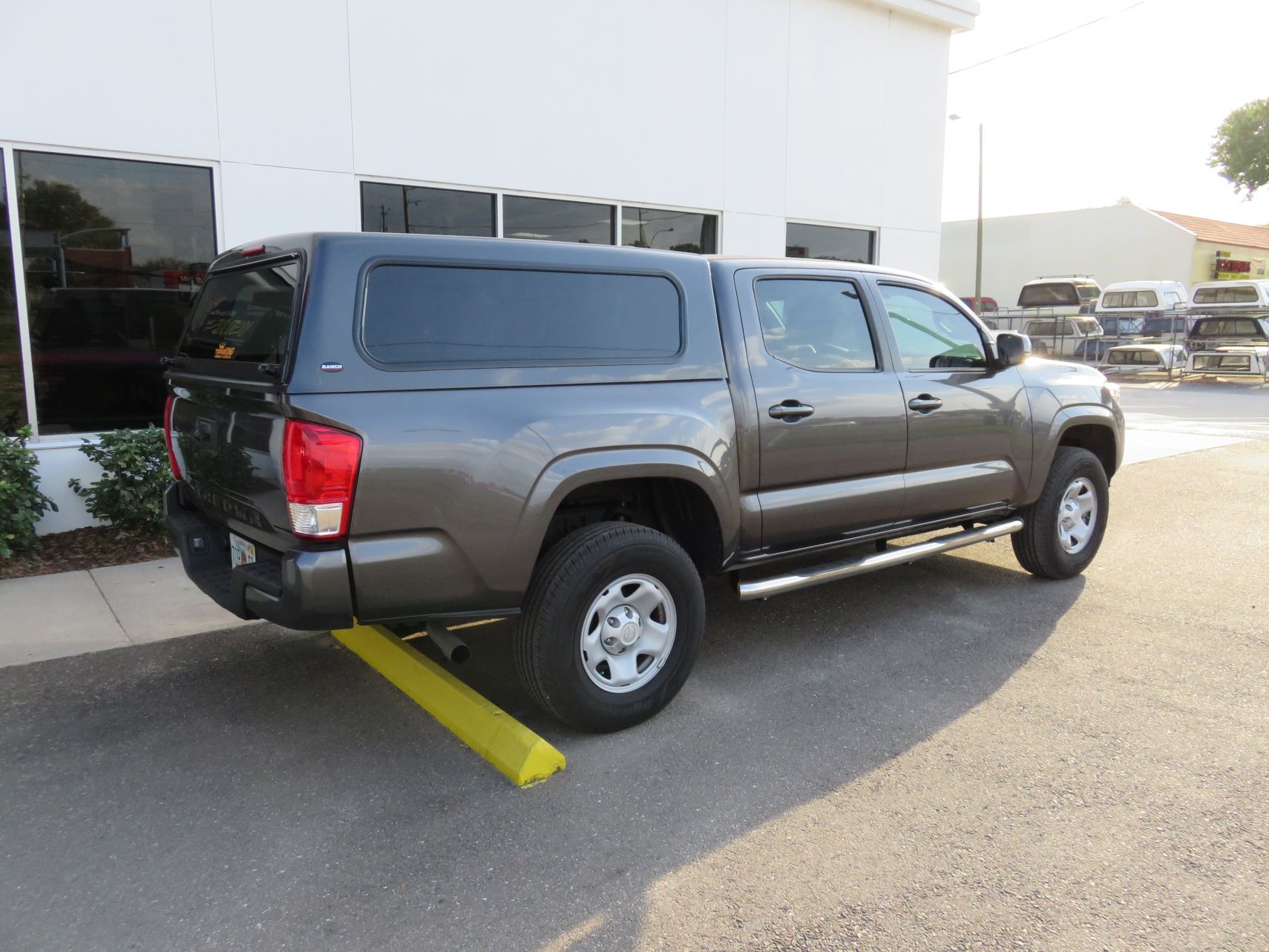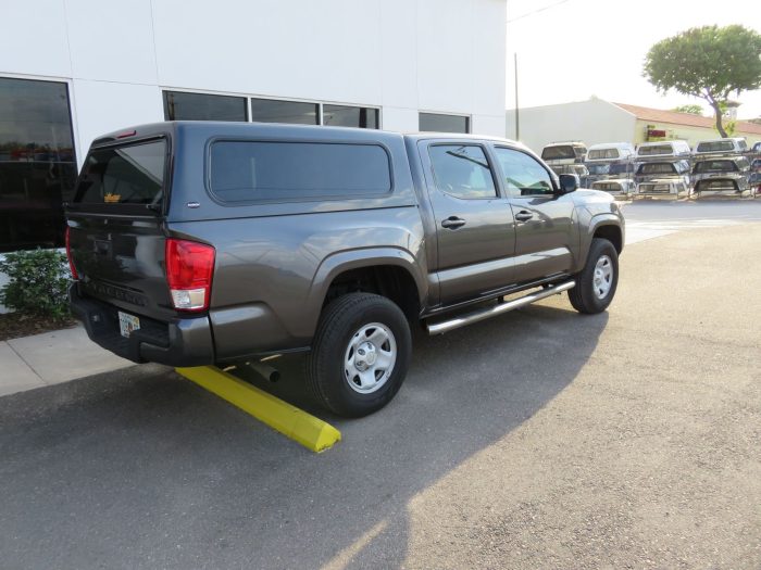 We recently had the pleasure of accessorizing this grey 2019 Toyota Tacoma with a brand new Ranch Echo fiberglass topper and Stainless Steel Nerf bars.